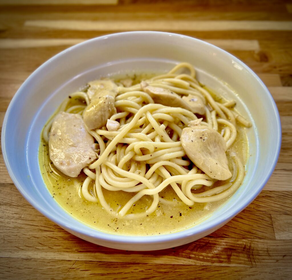 - Drain and plate pasta. Ladle in chicken and sauce.