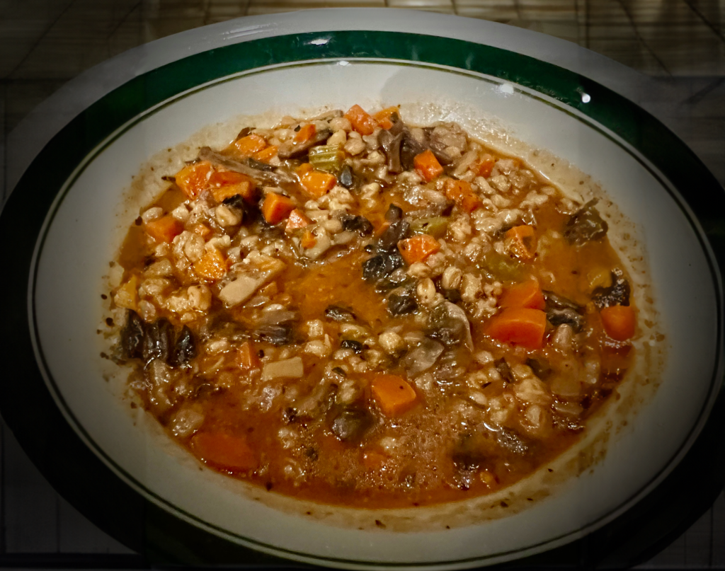 - Add tomato paste, soy sauce, Farro, and simmer for 25 mins.