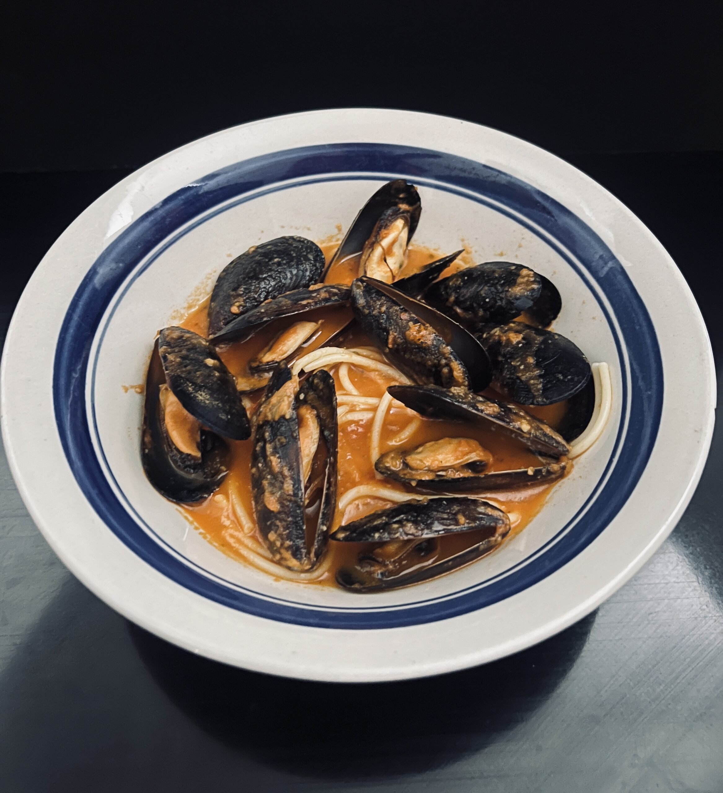 Drain the pasta and put in individual bowls. Top individual plates with the mussels and sauce.